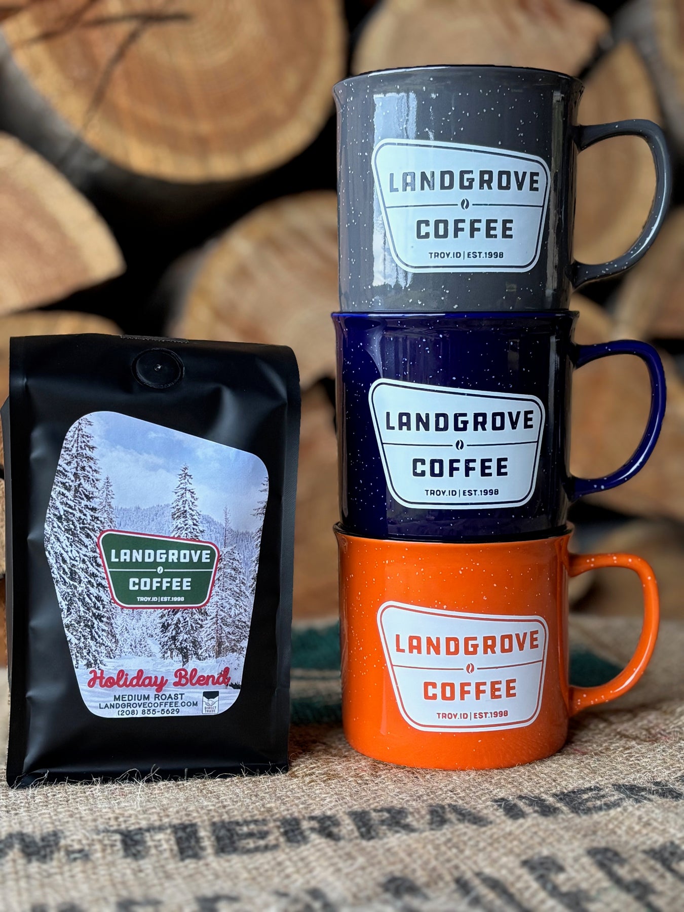 A mug and a bag of our seasonal Holiday Blend special coffee make a great gift for a loved one or for yourself. Choose from a blue, gray, or orange mug. Enjoy!